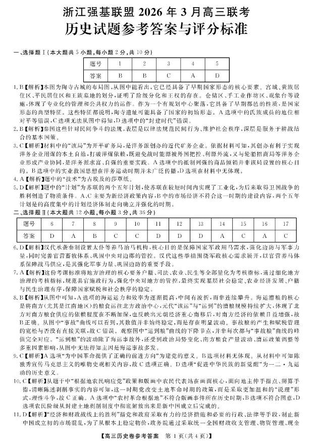 高三历史答案--浙江强基联盟2026届高三下学期3月联考(二模)