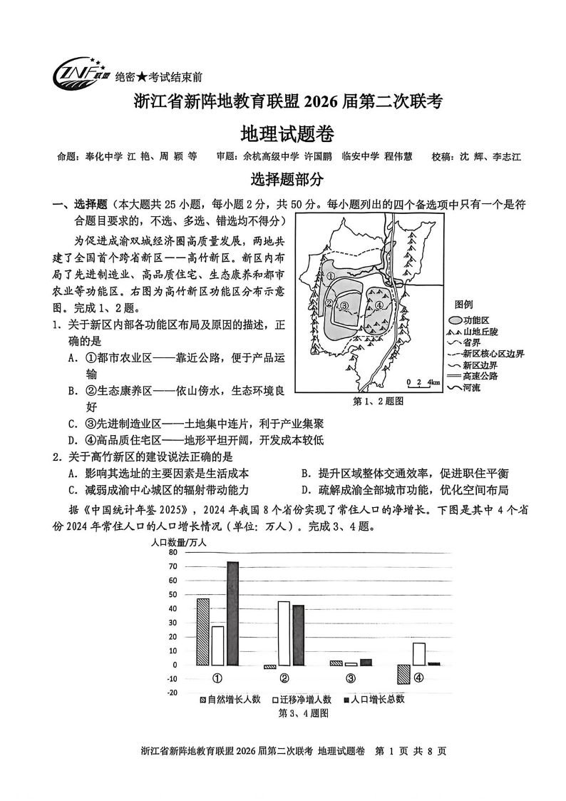 高三地理--浙江新阵地教育联盟2026届高三下学期3月开学考试
