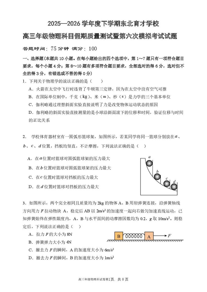高三物理--辽宁省东北育才学校2026届高三下学期第六次模拟考试