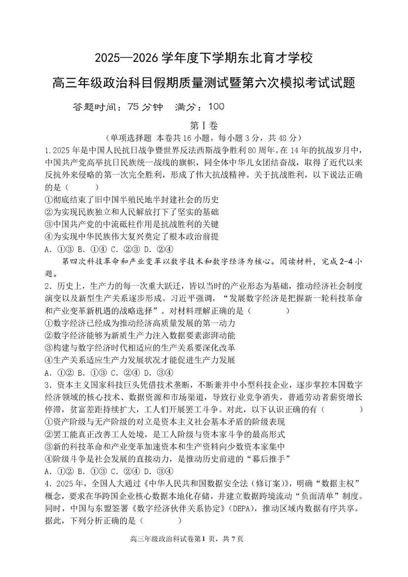高三政治--辽宁省东北育才学校2026届高三下学期第六次模拟考试