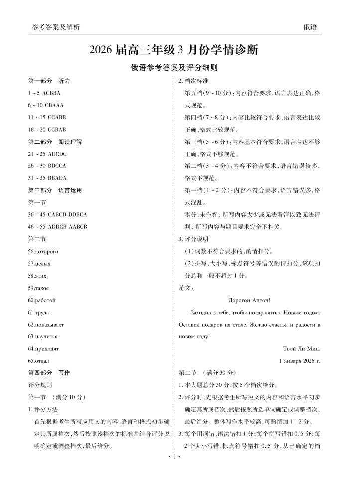 高三俄语答案--衡水金卷2026届高三年级3月份学情诊断