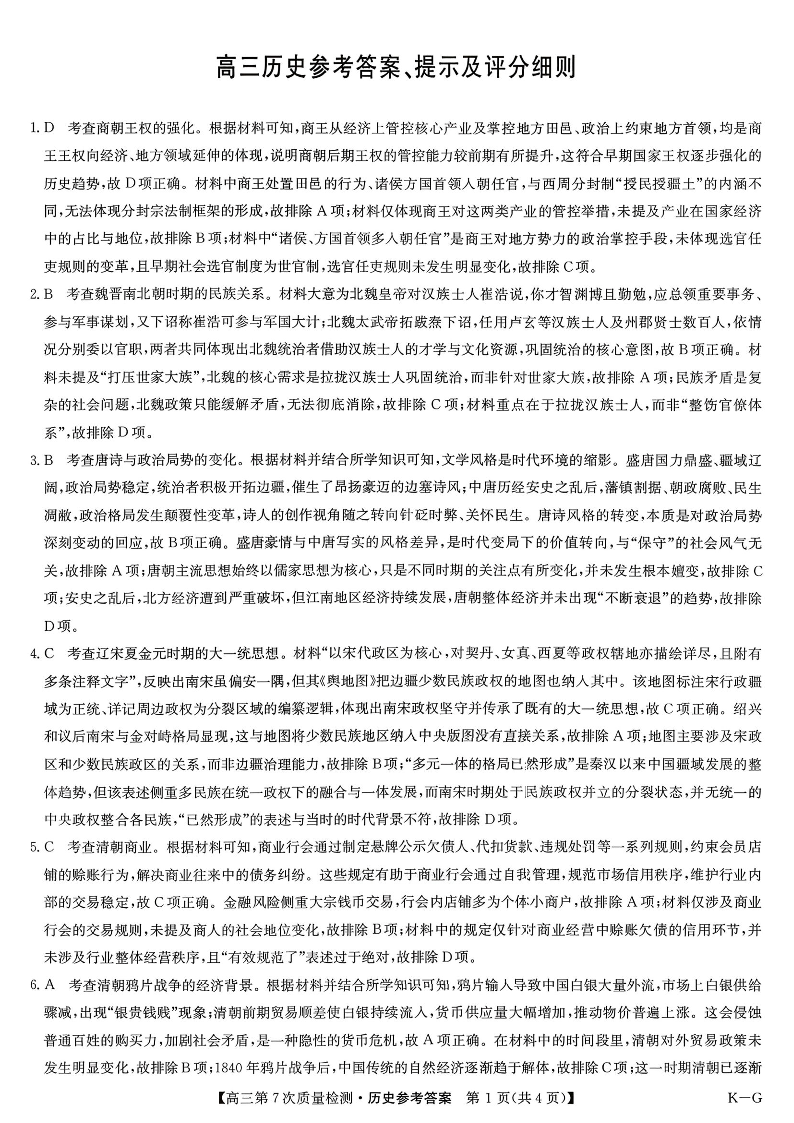 高三历史答案--九师联盟2026届高三3月第7次教学质量检测巩固卷