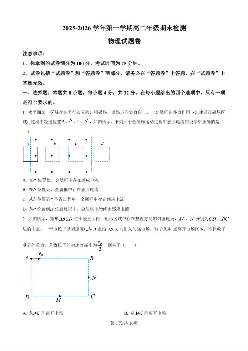 高二物理+答案--安徽省皖中名校2025-2026学年高二上学期2月期末联考检测