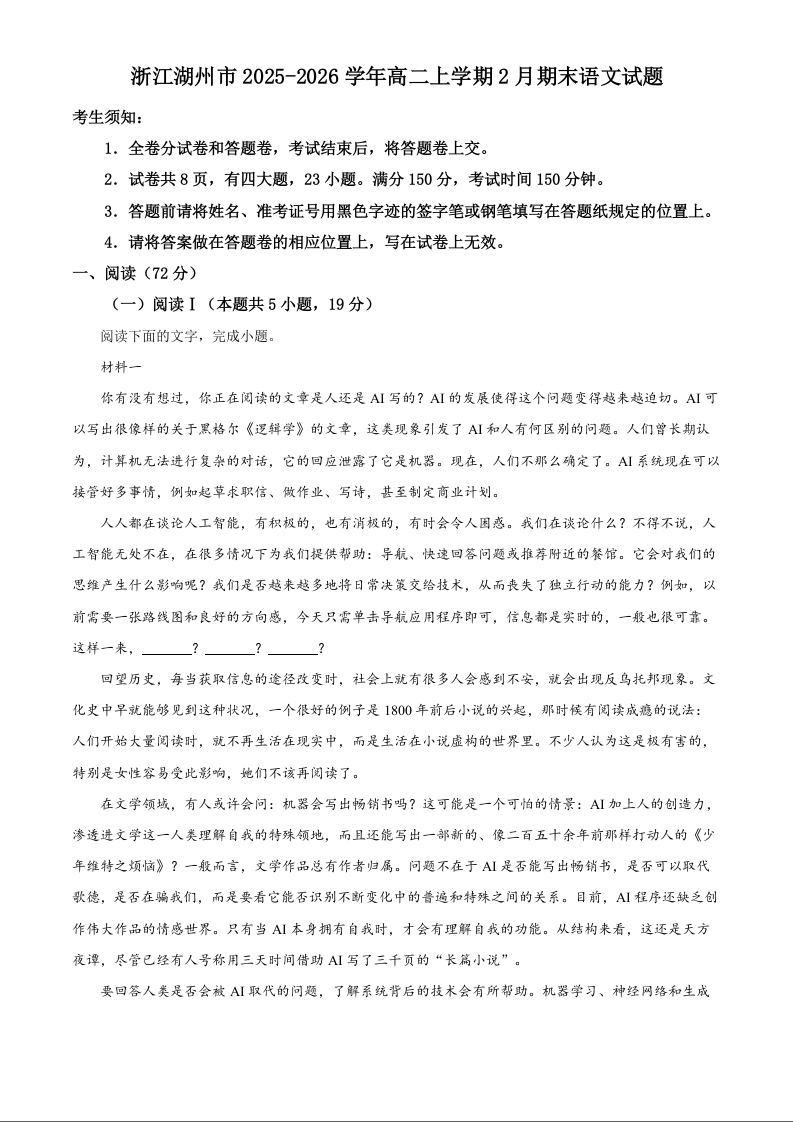 高二语文--浙江省湖州市2025-2026学年高二上学期2月期末考试