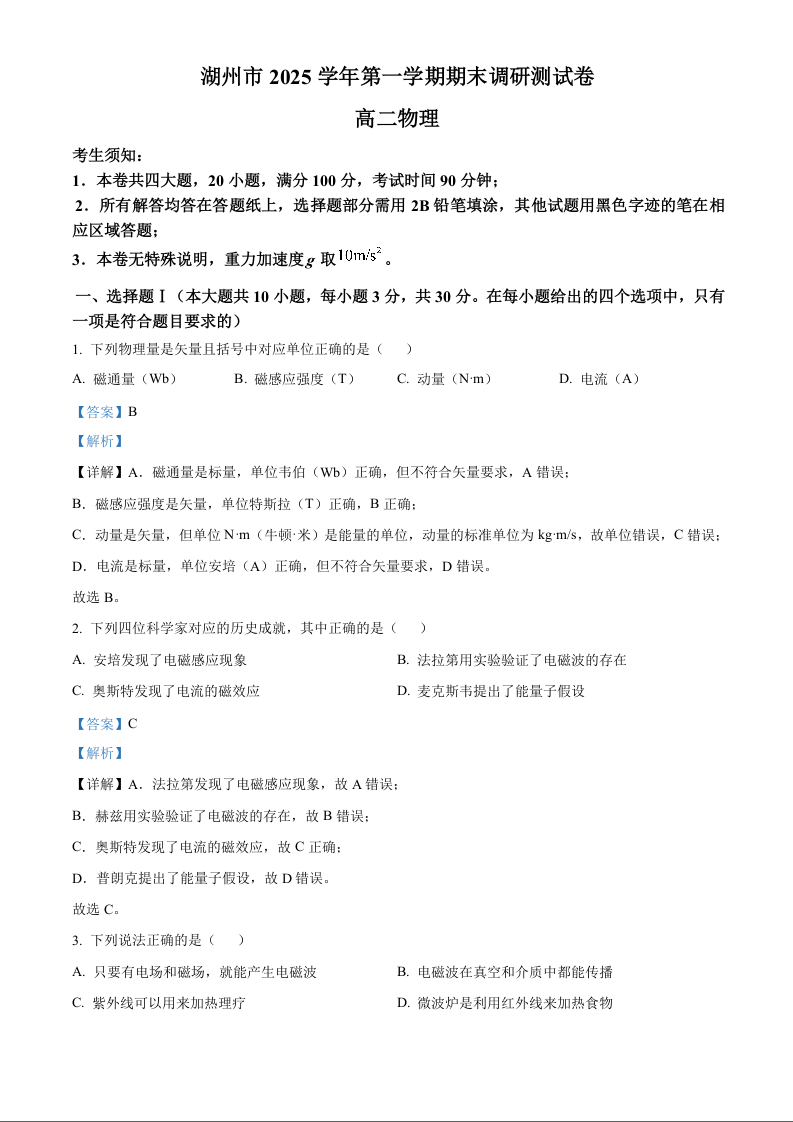 高二物理答案--浙江省湖州市2025-2026学年高二上学期2月期末考试