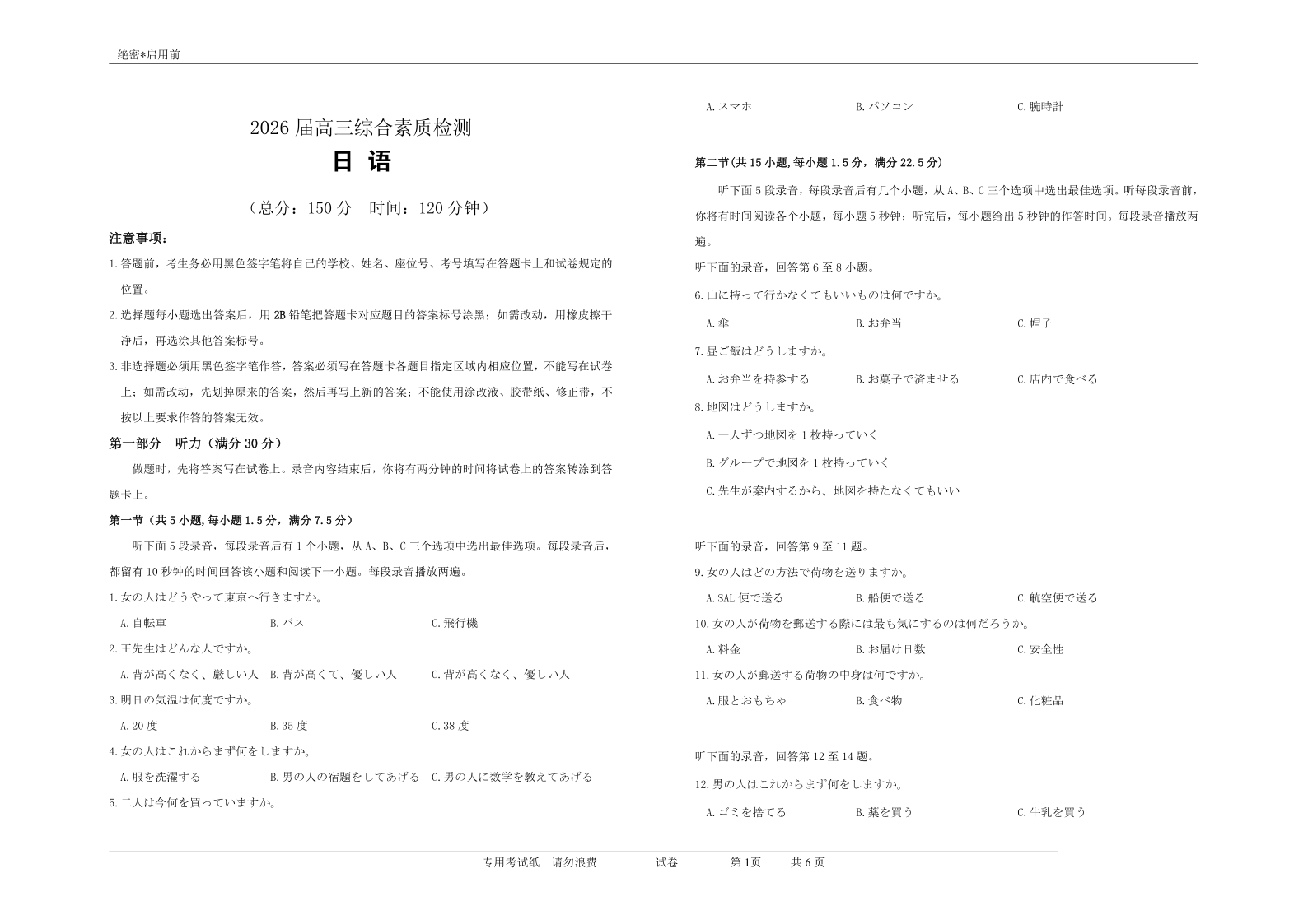 高三日语--安徽省江南十校2026届高三下学期3月开学考试