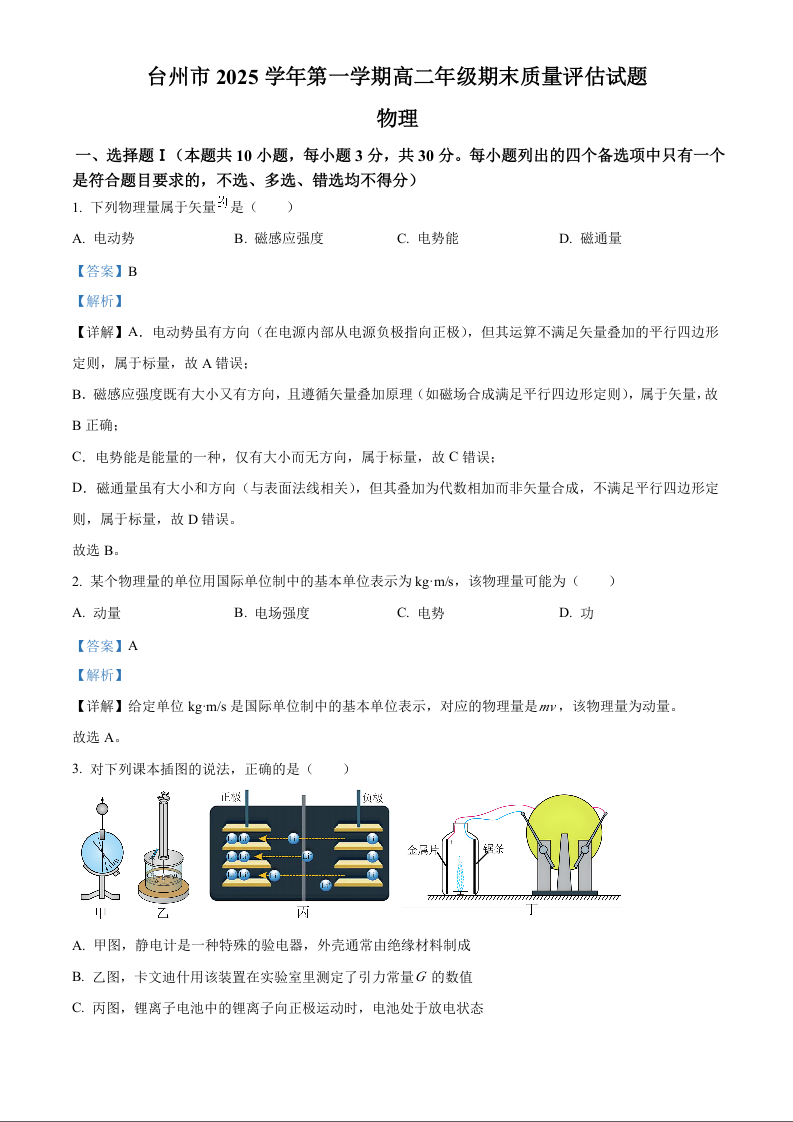 高二物理答案--浙江省台州市2025-2026学年高二上学期期末考试