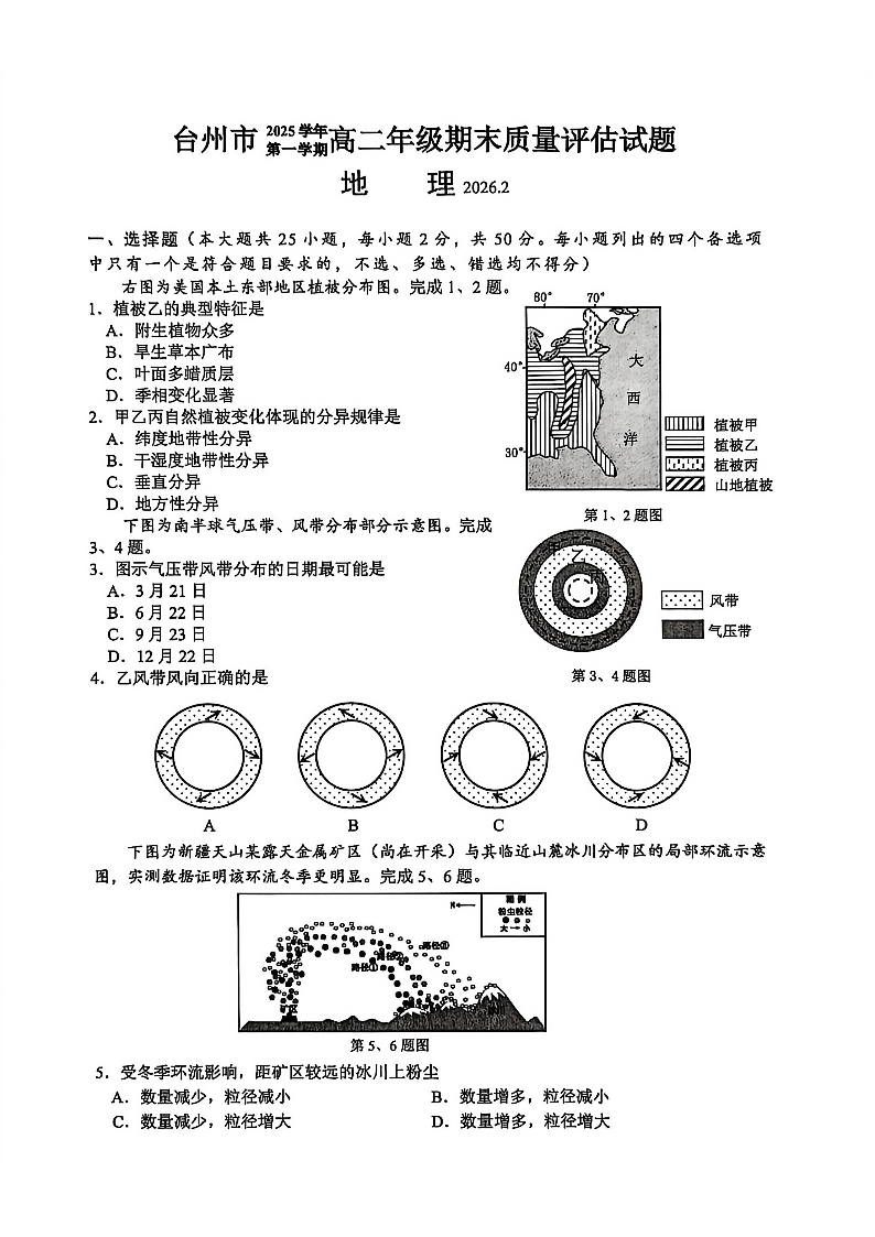 高二地理+答案--浙江省台州市2025-2026学年高二上学期期末考试
