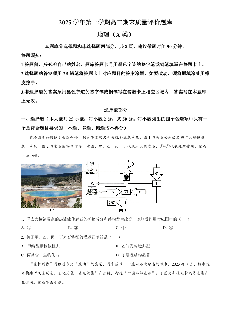 高二地理(A类)--浙江省温州市2025-2026学年高二上学期1月期末考试
