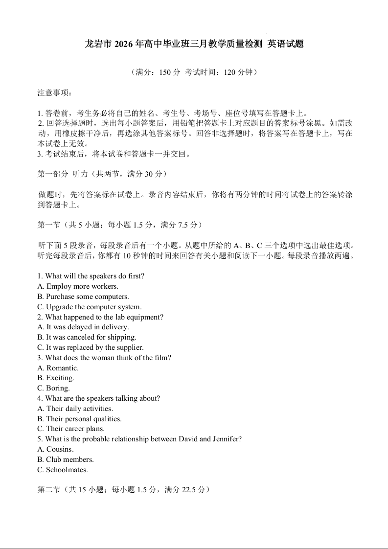 高三英语--福建省龙岩市2026届高中毕业班三月教学质量检测