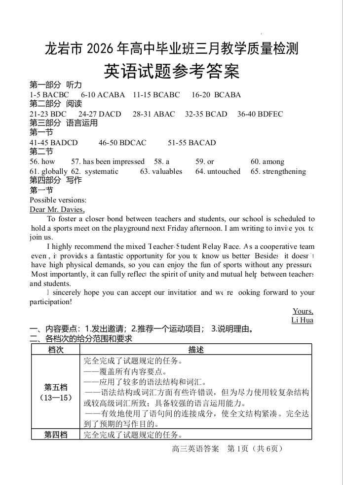高三英语答案--福建省龙岩市2026届高中毕业班三月教学质量检测