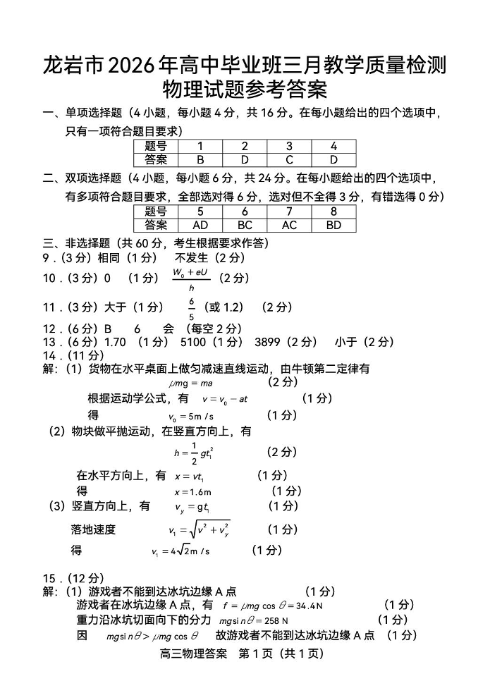 高三物理答案--福建省龙岩市2026届高中毕业班三月教学质量检测