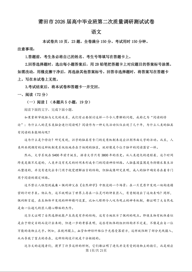 高三语文(精品解析版)--福建省莆田市2026届高三下学期第二次质量调研
