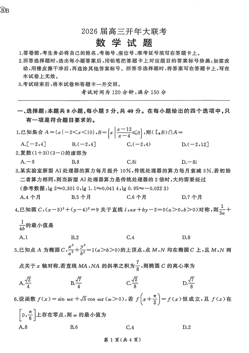 高三数学--河北省百师联盟2026届高三下学期开学大联考