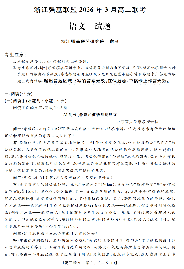高二语文--浙江省强基联盟2025-2026学年高二3月联考