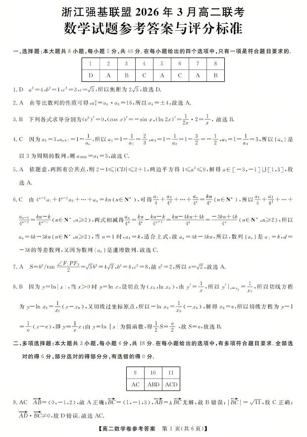 高二数学答案--浙江省强基联盟2025-2026学年高二3月联考