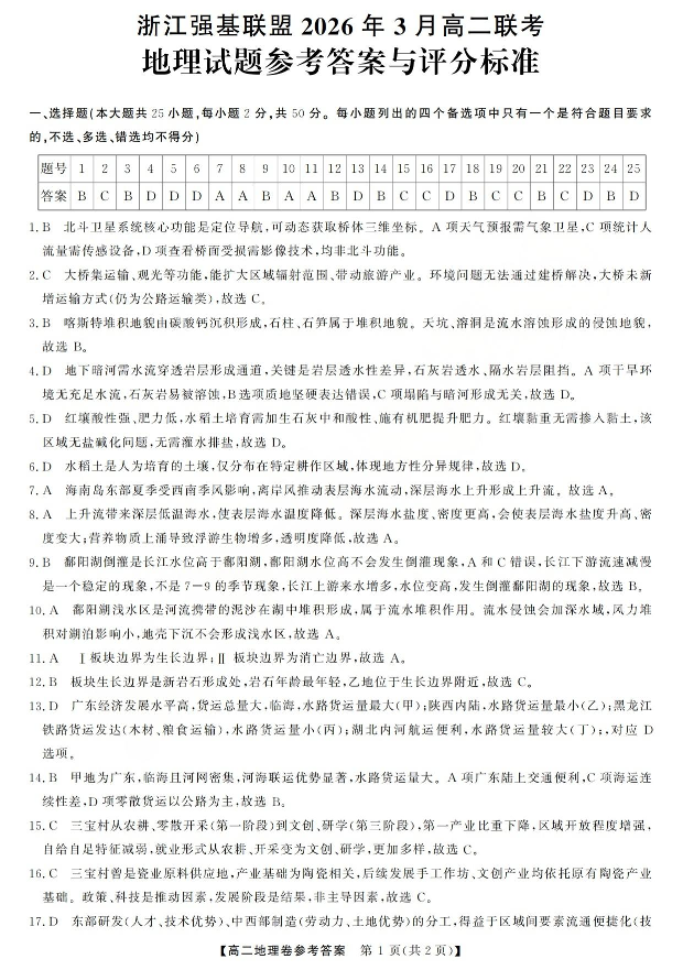 高二地理答案--浙江省强基联盟2025-2026学年高二3月联考