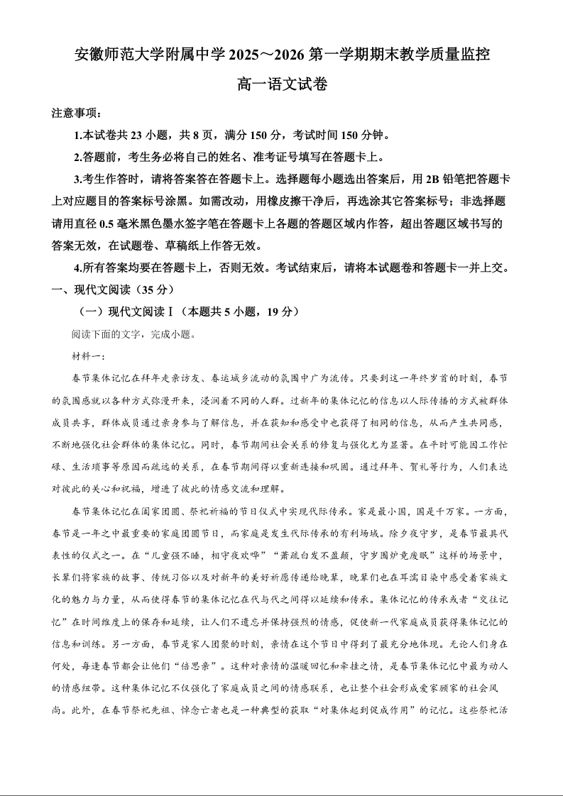 高一语文(解析版)--安徽省芜湖市师大附中2025-2026学年高一上学期期末