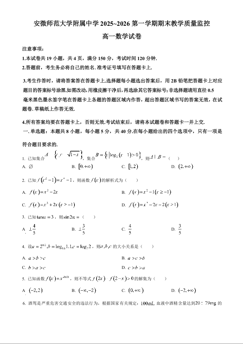 高一数学(原卷版)--安徽省芜湖市师大附中2025-2026学年高一上学期期末