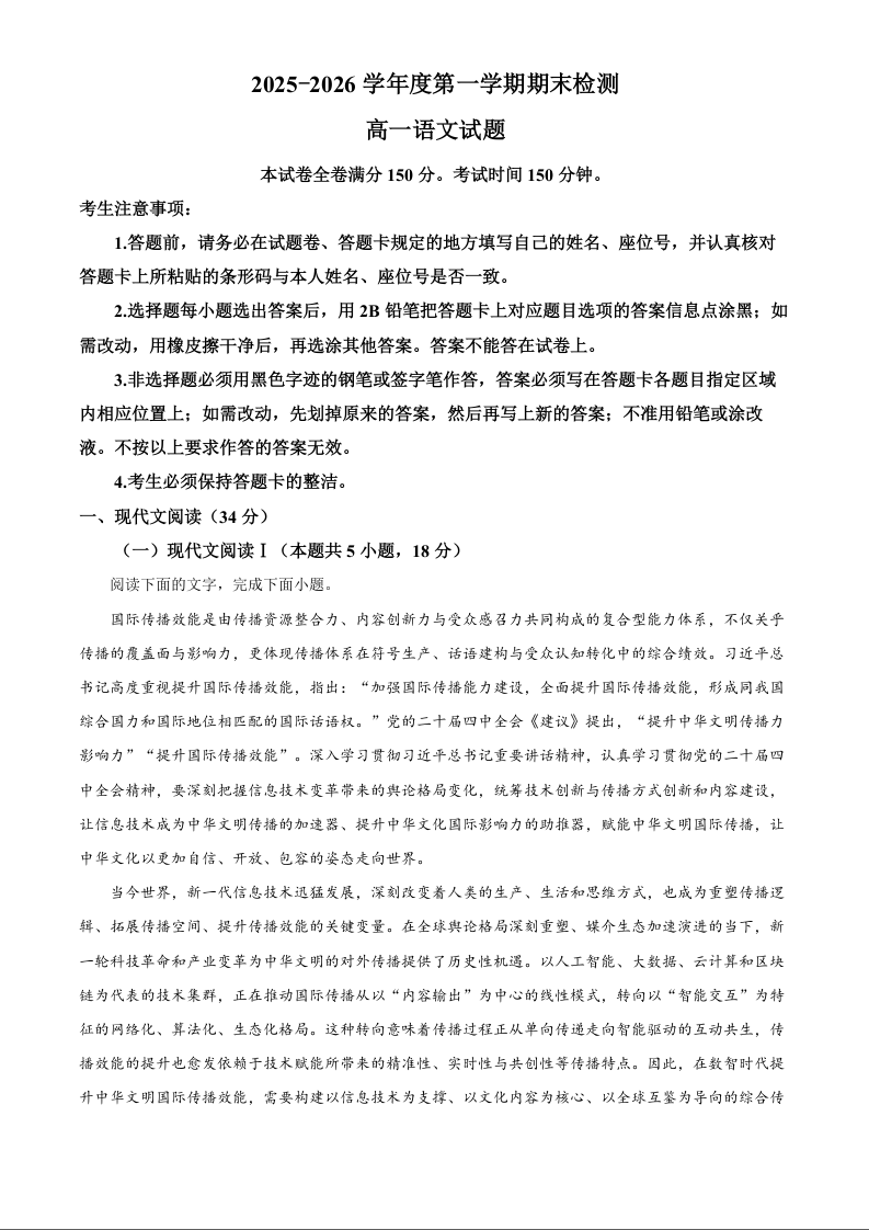 高一语文(解析版)--安徽省宣城市2025-2026学年高一上学期期末检测