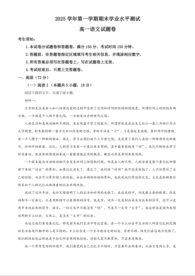 高一语文--浙江省杭州市2025-2026学年高一上学期期末学业水平测试