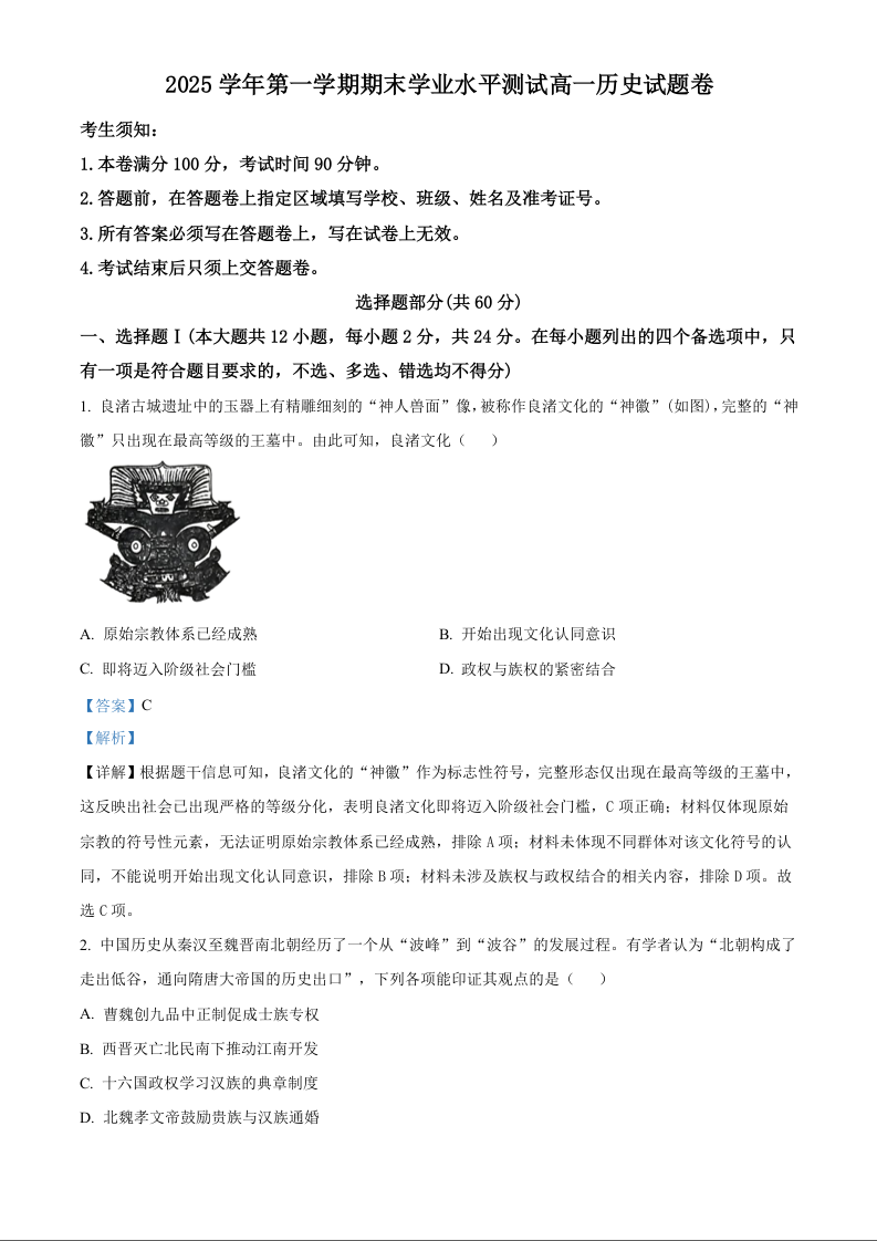 高一历史答案--浙江省杭州市2025-2026学年高一上学期期末学业水平测试