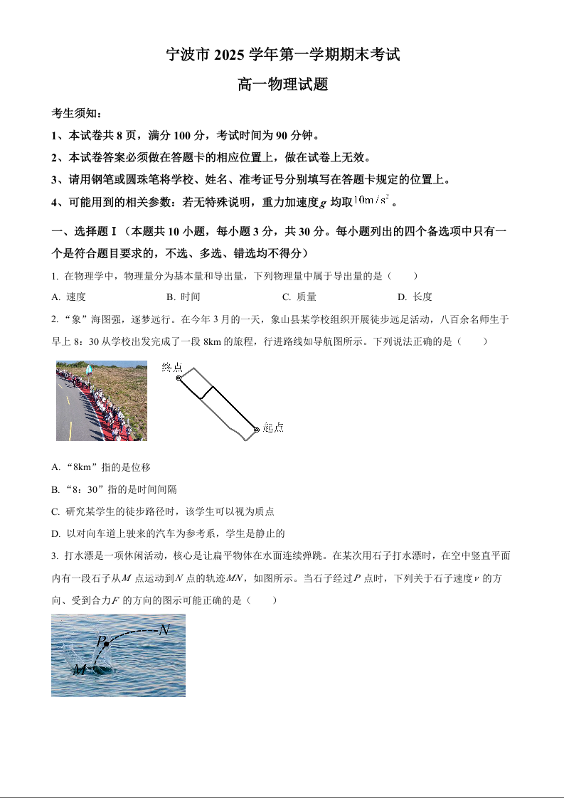 高一物理--浙江省宁波市2025-2026学年高一上学期期末考试
