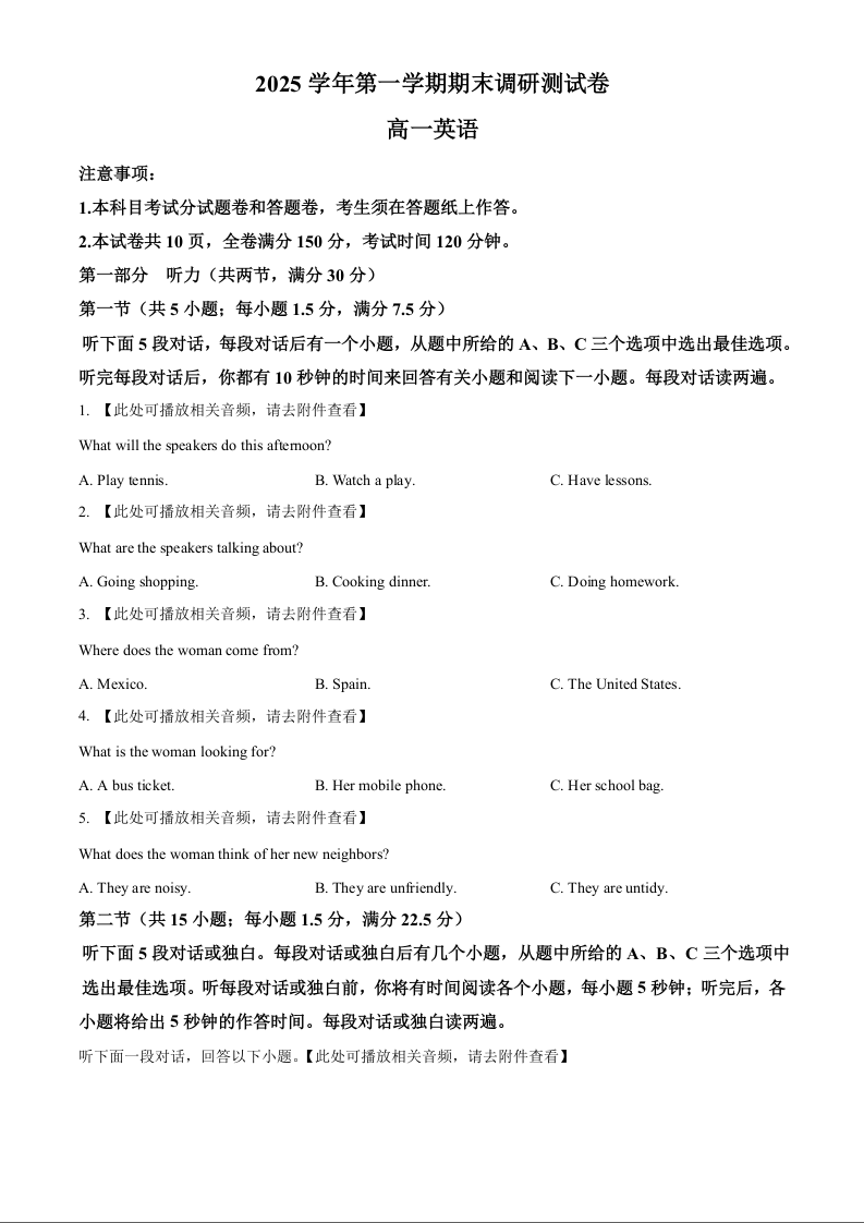 高一英语--浙江省湖州市2025-2026学年高一上学期2月期末考试