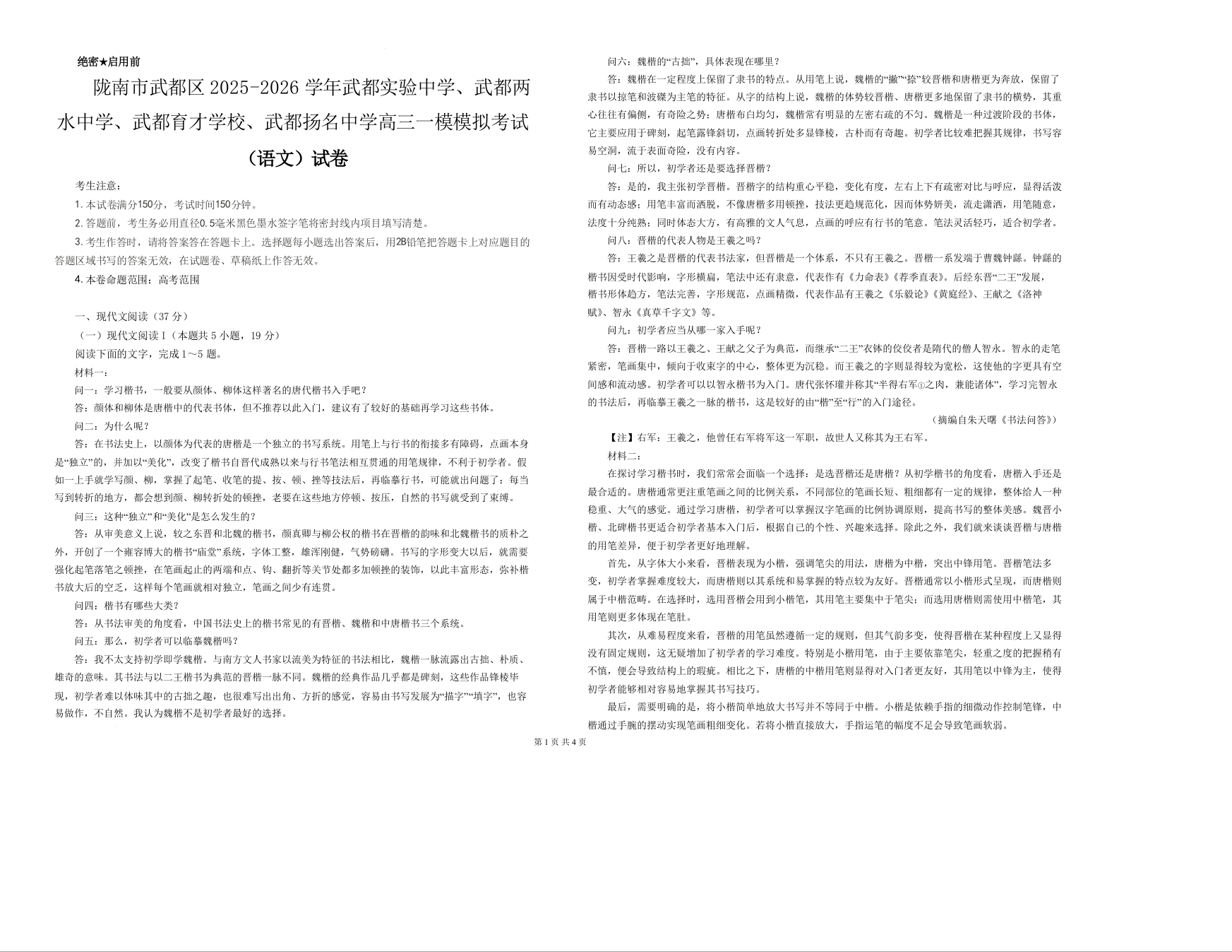 高三语文--甘肃省陇南市武都区武都实验中学、武都两水中学、武都育才学校、武都扬名中学2026届高三下学期一模模拟考试