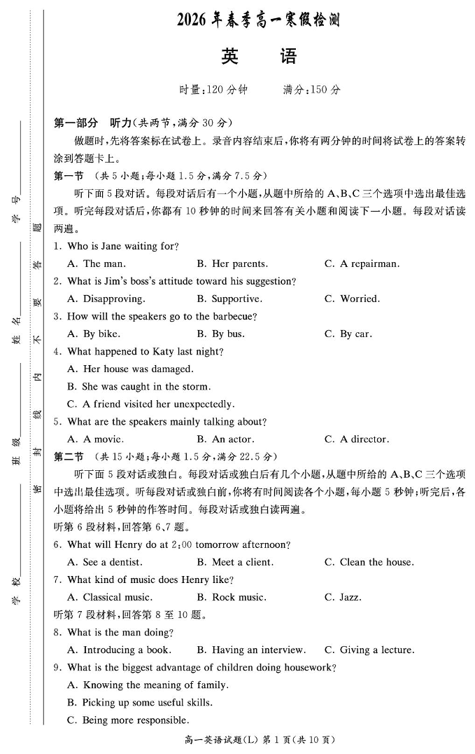高一英语--湖南省长沙市长郡中学2025-2026学年高一下学期入学考试