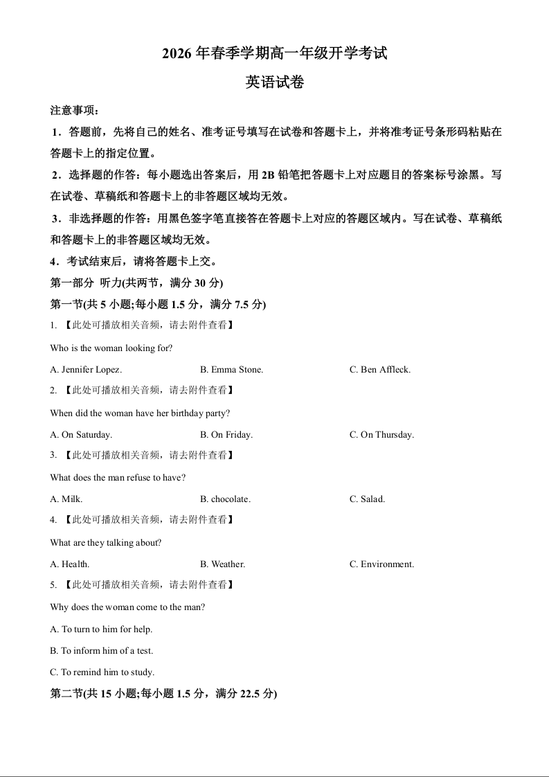 高一英语--湖北省恩施高中教学联盟2025-2026学年高一下学期开学考试