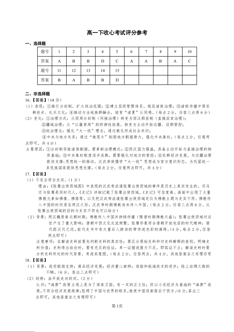高一历史答案--湖北省恩施高中教学联盟2025-2026学年高一下学期开学考试