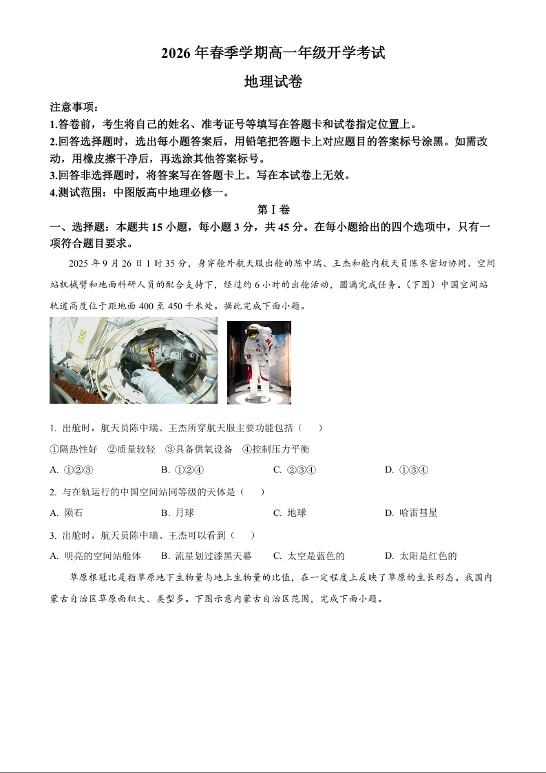 高一地理--湖北省恩施高中教学联盟2025-2026学年高一下学期开学考试