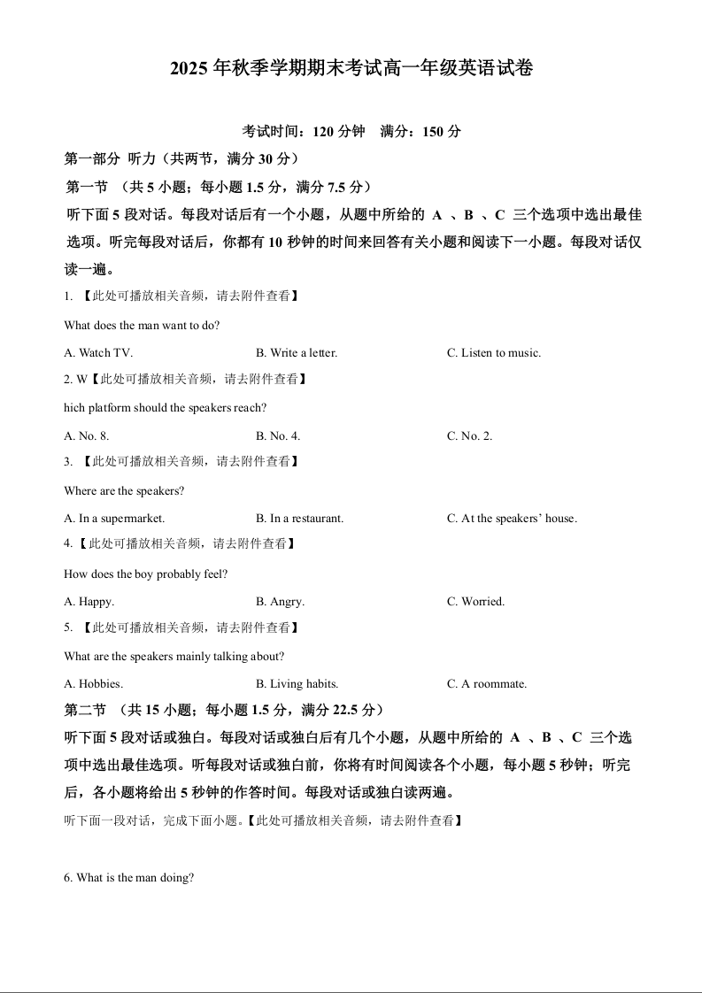 高一英语(原卷版)--安徽省合肥市第五中学等六校2025-2026学年高一上学期期末联考