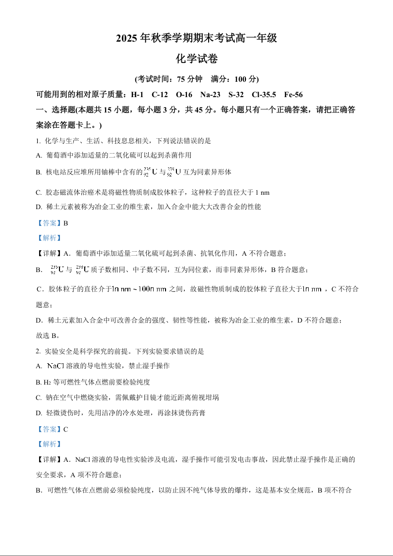高一化学(解析版)--安徽省合肥市第五中学等六校2025-2026学年高一上学期期末联考