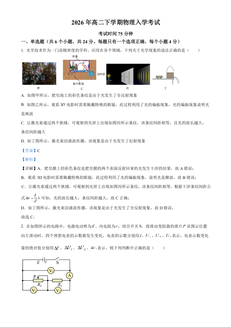 高二物理(解析版)--湖南省邵阳市第二中学2025-2026学年高二下学期入学考试