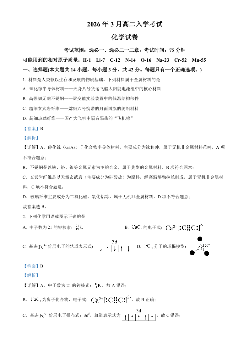 高二化学(解析版)--湖南省邵阳市第二中学2025-2026学年高二下学期入学考试