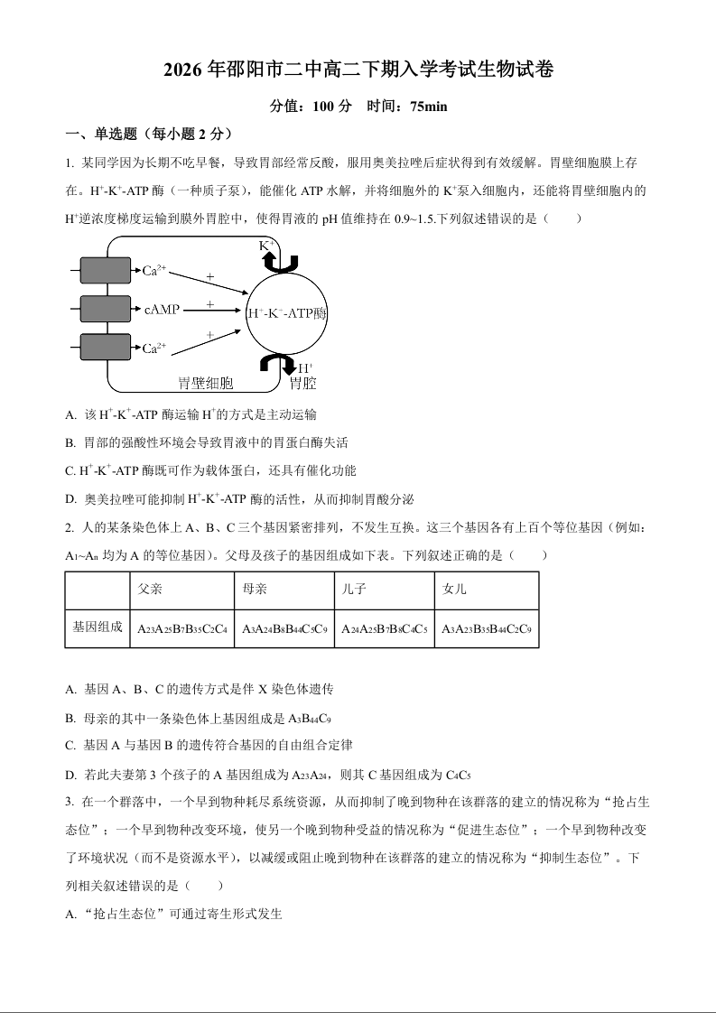 高二生物(原卷版)--湖南省邵阳市第二中学2025-2026学年高二下学期入学考试