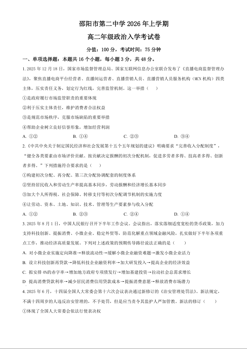 高二政治(原卷版)--湖南省邵阳市第二中学2025-2026学年高二下学期入学考试