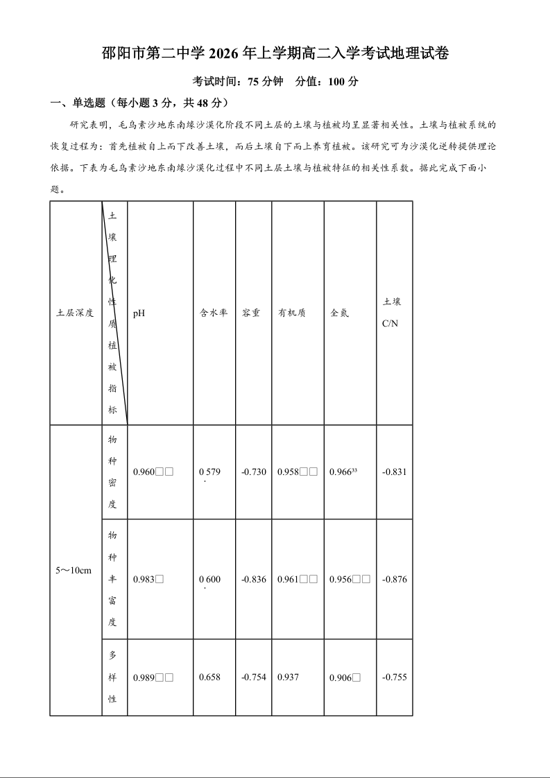 高二地理(原卷版)--湖南省邵阳市第二中学2025-2026学年高二下学期入学考试