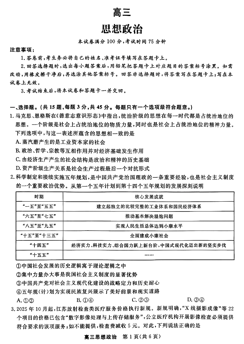 高三政治--江苏省九校重点高中2026届高三下学期3月联考