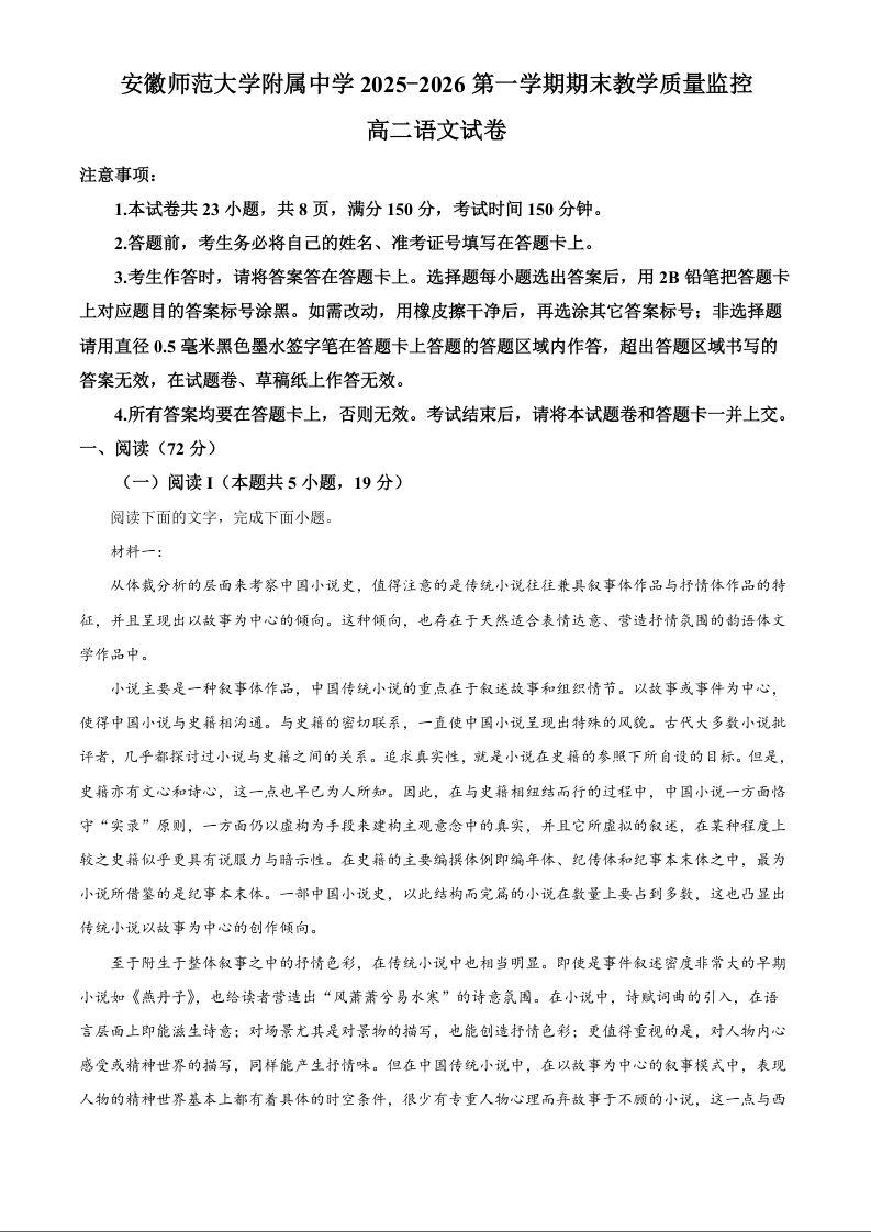 高二语文(解析版)--安徽省芜湖市师大附中2025-2026学年高二上学期期末考试