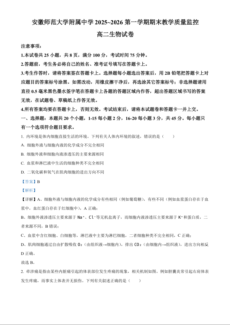 高二生物(解析版)--安徽省芜湖市师大附中2025-2026学年高二上学期期末考试