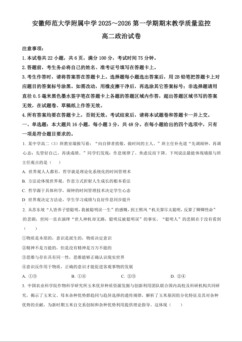 高二政治(原卷版)--安徽省芜湖市师大附中2025-2026学年高二上学期期末考试