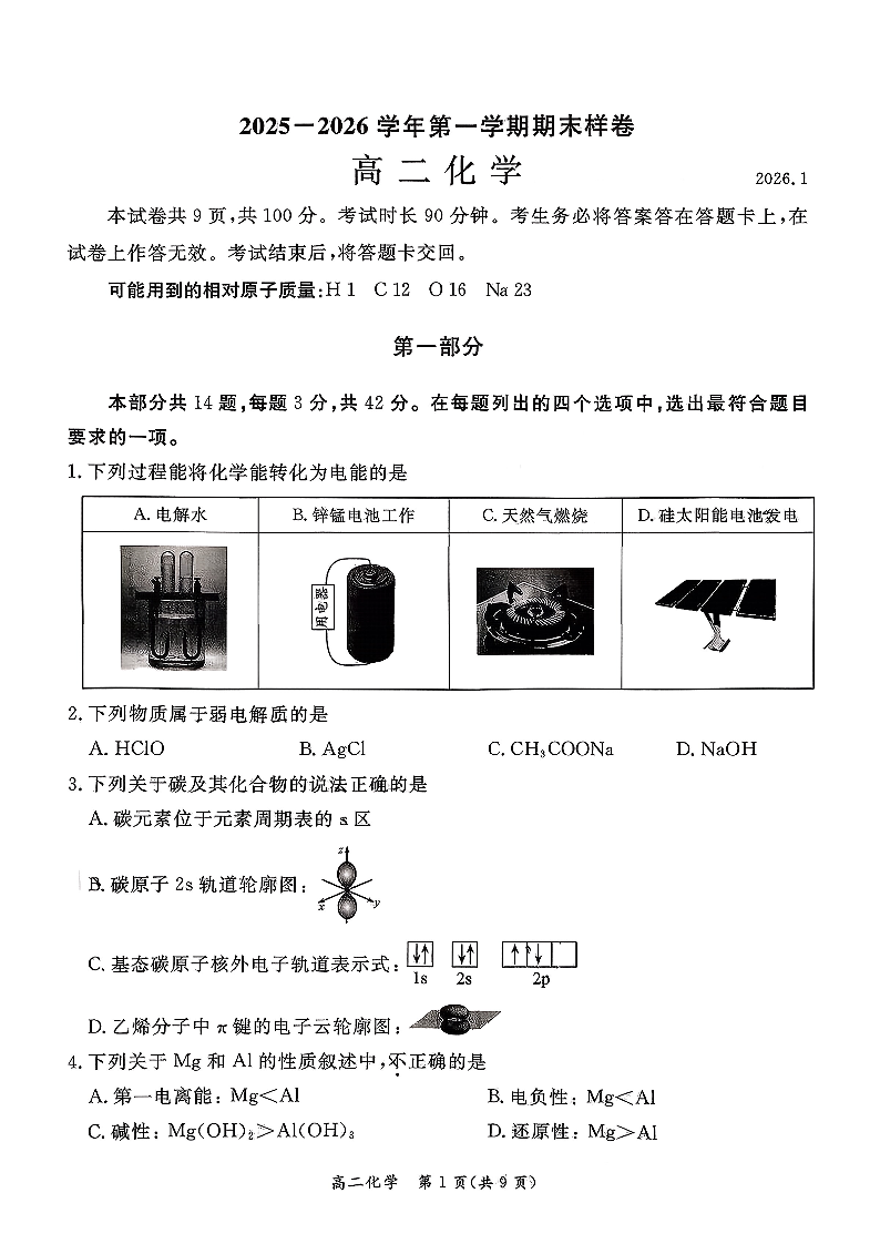 高二化学+答案--北京市东城区2025-2026学年高二上学期期末考试