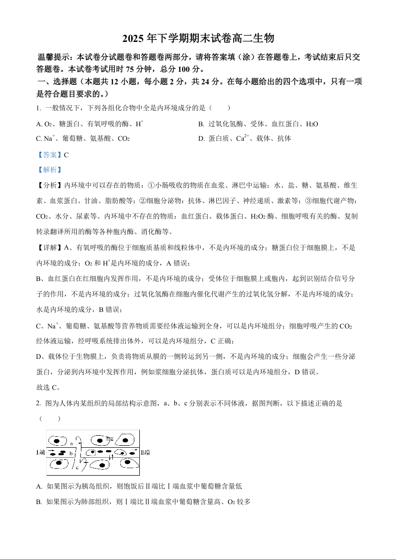 高二生物(解析版)--湖南岳阳市岳阳楼区2025-2026学年高二上学期期末考试
