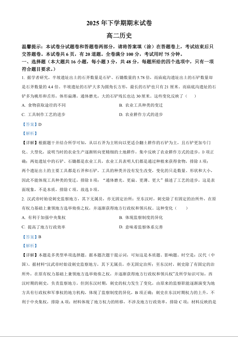 高二历史(解析版)--湖南岳阳市岳阳楼区2025-2026学年高二上学期期末考试