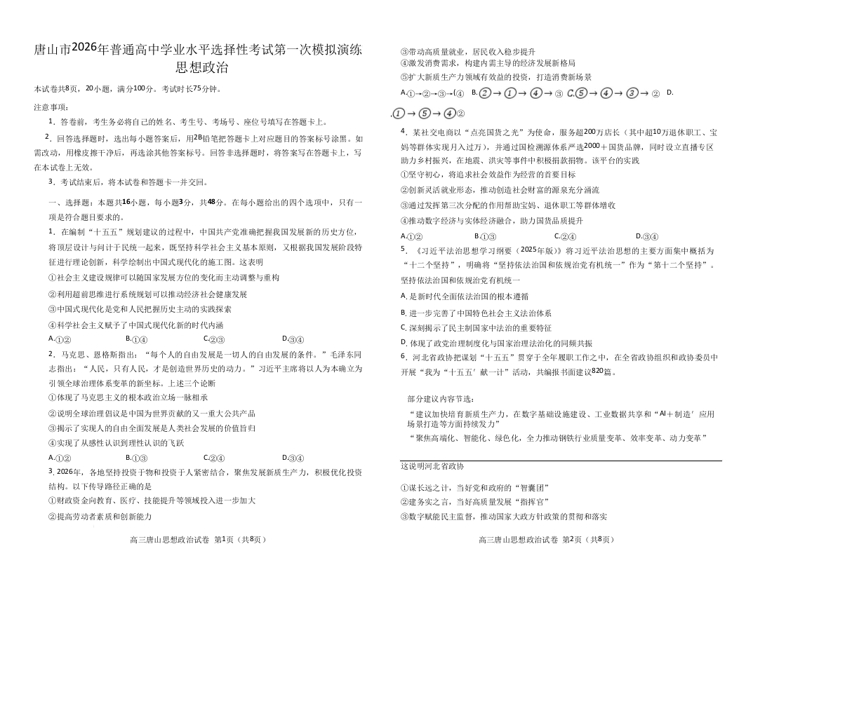 高三政治--河北省唐山市2026届高三下学期3月第一次模拟演练