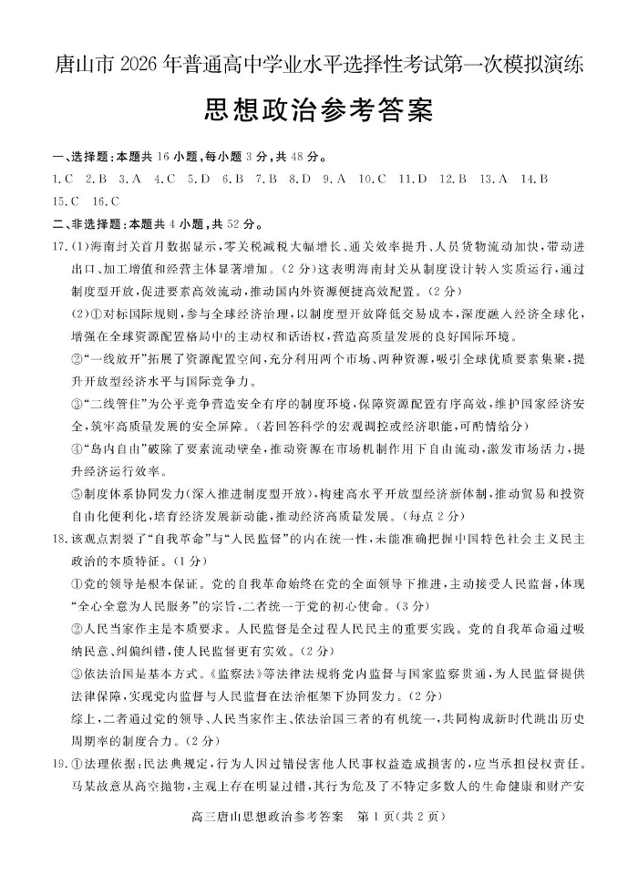 高三政治答案--河北省唐山市2026届高三下学期3月第一次模拟演练