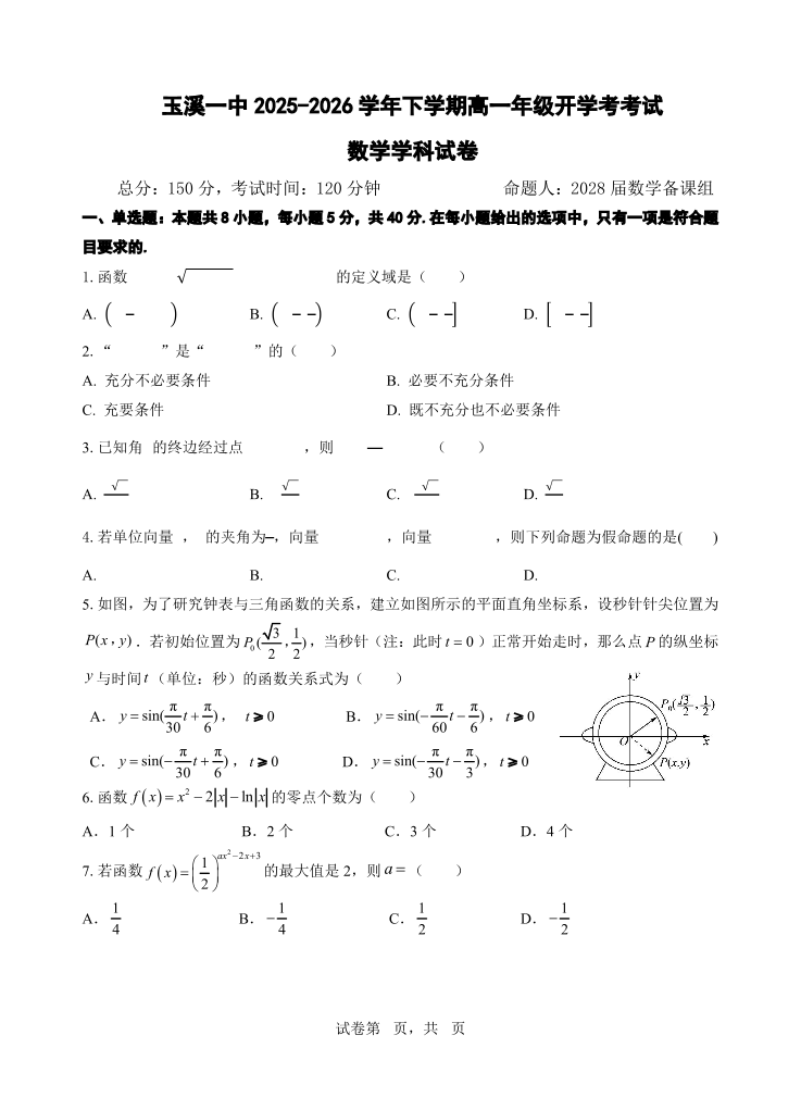 高一数学--云南省玉溪市一中2025-2026学年高一下学期开学考试